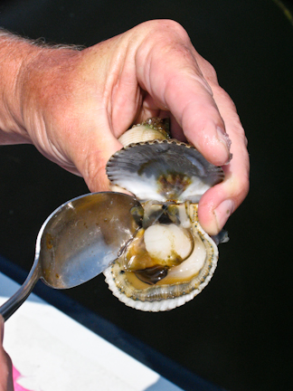 Scallops taste pretty good raw, right out of the water. I don’t know actually how safe that is, but you’re eating the muscle and not the internal organs. A quick squeeze of lime juice and a dash of salt and pepper probably make them safer, and they sure are tasty. *